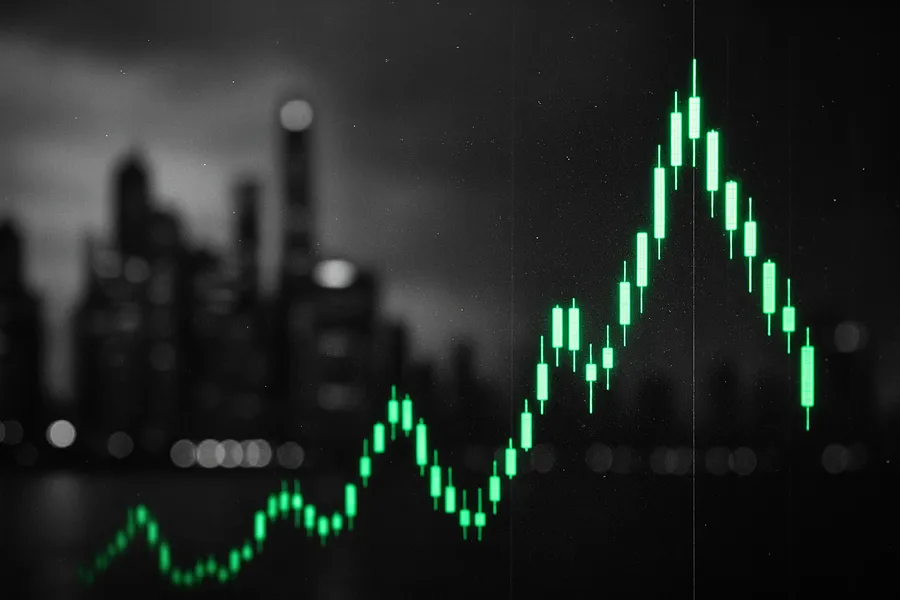 Illuminated stock market chart with cityscape background